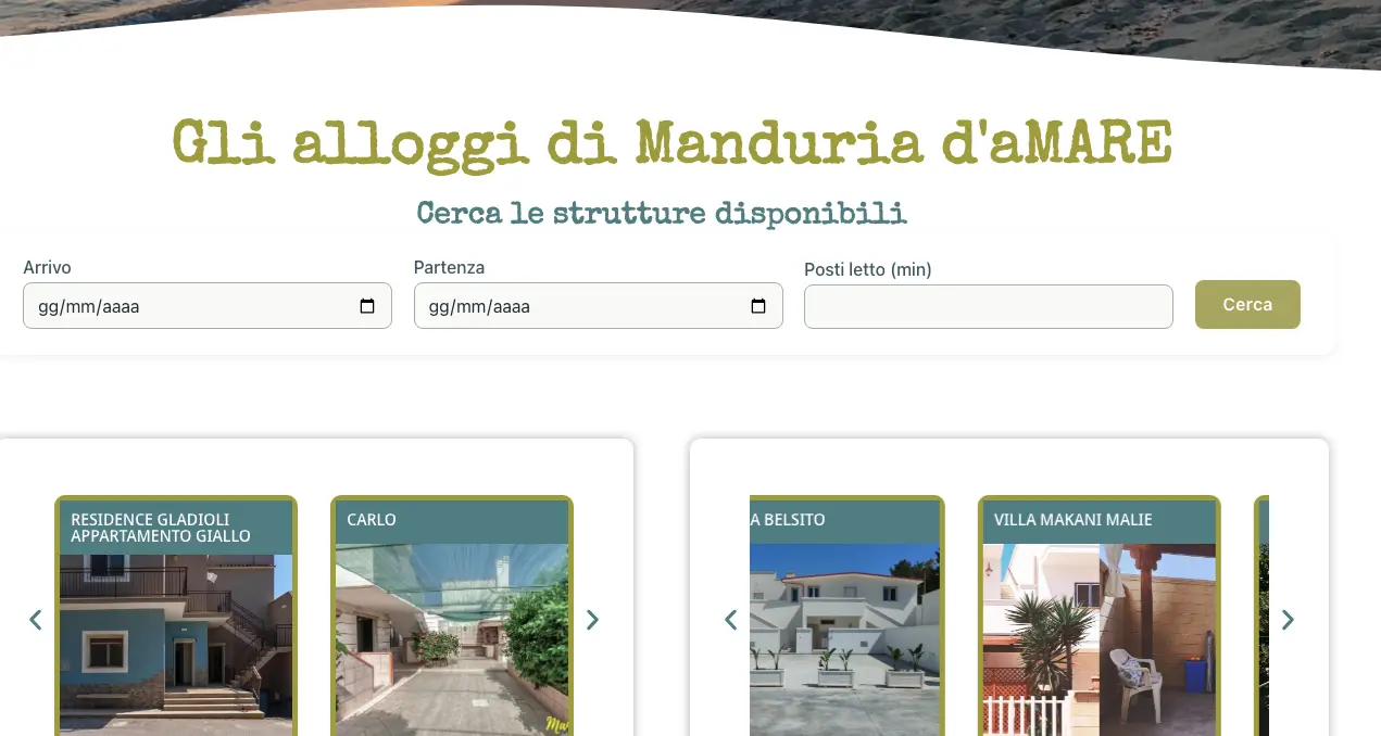 All’interno del progetto è stato inoltre sviluppato un modulo di ricerca avanzato che consente agli utenti di filtrare facilmente le strutture disponibili in base ai principali criteri di soggiorno, come date di arrivo e partenza e numero minimo di posti letto. Questo sistema permette ai visitatori di individuare rapidamente le soluzioni più adatte alle proprie esigenze.