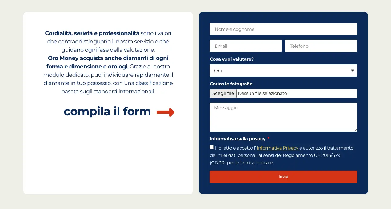All’interno del sito è stato sviluppato un modulo dedicato alla richiesta di valutazione dei preziosi, pensato per permettere agli utenti di inviare facilmente una richiesta di quotazione.