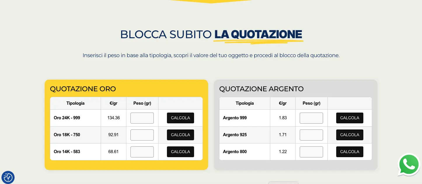 Il sistema permette agli utenti di inserire il peso dell’oggetto in base alla tipologia di metallo e caratura, calcolando automaticamente il valore stimato in base alla quotazione corrente.
